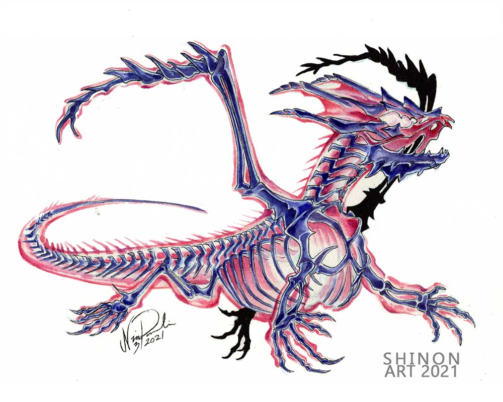 Eternatus is a gigantic, draconic alien Pokémon. Its body has a vaguely draconic shape and a skeletal appearance, and is largely dark violet with red highlights. Its main body and tail are long, thin, and resemble a spinal column, and it has four small, thin limbs ending in claws formed from spindly appendages attached at right angles.